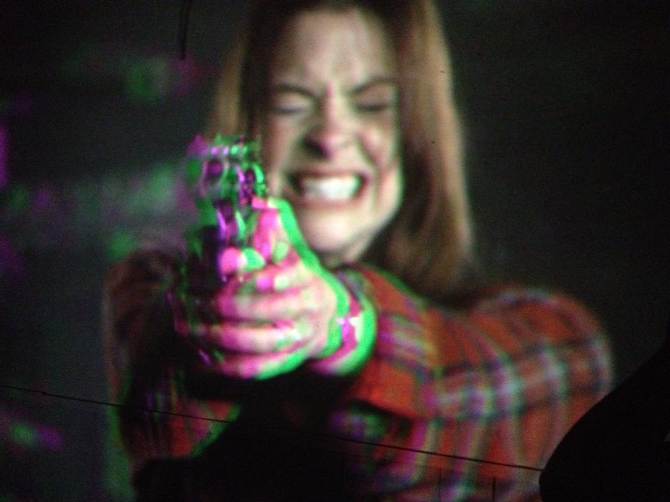 around the room she would follow you with the gun!