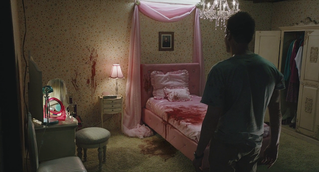 This is not a good film, yes I am referring to "The Call" as the title suggests. I watched this entire movie because it was on and I cant help but finish a film I've gotten 15min into. This movie is all about trying to make 911 operators a new american hero, as the picture above totally depicts (The use of the low angle gives her power as the flag over her shoulder implies her struggle). The thing that makes "The Call" worth writing about is this hidden gem of a scene. The scene I'm talking about starts about 1:16 into the film, it depicts the totally lame ass killer (until this point) reveling his back story. Here's a couple pictures of what I'm talking about (I just posted a Gif on my Tumblr.):