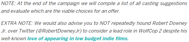 "But wait, didn't you say the film was already funded?" you may be thinking. Yes, that was not mistake, but that's not what the campaign is trying to do. The whole purpose of this fund raiser is to involve us, the fans, in building this sequel up the way we would like to see it. There is a key aspect that the film makers are asking us to help decide: what flavor of star power should WolfCop 2 have? With every reward that you select from the crowd funding campaign, you will also receive 3 hero tickets, which you can use to vote for whoever you think should be in the film. And they really mean it when they say anyone, from your dad to Miley Cyrus. That's what they will be putting the campaign money towards - making our wishes come true.