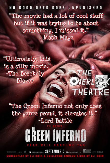 Lord Battle - "It's amazing that we actually get to see a film like The Green Inferno in theaters. It's not a perfect film but then again, it might be. Eli Roth is an auteur and not just in the sense that all his films contain frat boys drinking, air-heads flashing, and everyone smoking. Roth manifests as a dark humor that floats throughout his films and every time you get caught up in the horror and mayhem, Eli winks at you. The Green Inferno not only does the genre proud, it elevates it." - 5 Stars