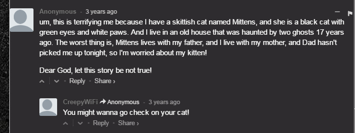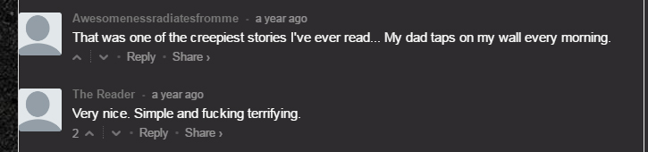 The icing on the pasta for this story was the reveal at the end. The words "BEHIND YU" and "NEXT T YU" carved into the closet lost some people, as it seems like a lazy typo (which happens a lot on Creepy Pasta...) but when you are thinking about it a couple hours later you may also start to wonder why they are all in caps... The answer is pretty simple when you start to think about what the "Tapping" was the whole time and how hard it might be to scratch an "O".