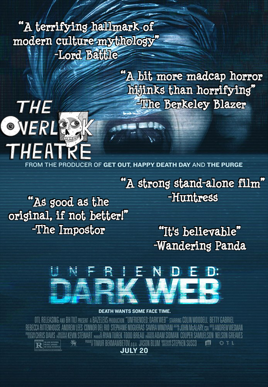 The Berekely Blazer - "The original Unfriended was immersive, using a virtually uninterrupted social media viewer POV to tell the familiar story of teenagers of dubious morality being punished for their supposed sins in a riveting way. This sequel changes the focus from supernatural (?) ghost revenge to diabolical dark web haxxors, hence the title Dark Web. Once again, we are pulled into the lives of assorted lively young Skype faces, this time former college chums who are overall less juvenile in age and manner than the first Unfriended. The computer screen conception still holds together here, and the promise of our cast wandering closer and closer to danger drives us to care about (or at least take interest in) their fate, even when things take a turn for the mildly absurd. Despite having a relatively realistic premise, Dark Web feels a bit more madcap horror hijinks than horrifying. It’s never not interesting, but 2/3rds of the way in I lost a sense of tension and was amusedly yet genuinely curious about how everything would unfold. Mild non-narrative spoiler: the film becomes a Rube-Goldberg of death showpiece i.e. a non-supernatural final destination. It doesn’t hurt the film, but it’s ultimately not as disturbing as straightforward rising emotional crescendo that was the original. A final note: Dark Web is surprisingly restrained when it comes to gore, considering how it’s been promoted. I appreciated this, but particular types of horror people may leave the theatre dissatisfied." - 3.5 Stars